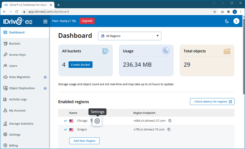 Yes, you can replace IDrive® e2 specific region domain names with your own domain names. You need to create a CNAME record for your domain name server and point that to your e2 region domain name. The Dashboard on the web console lists the IDrive® e2 specific domain names of each enabled region.